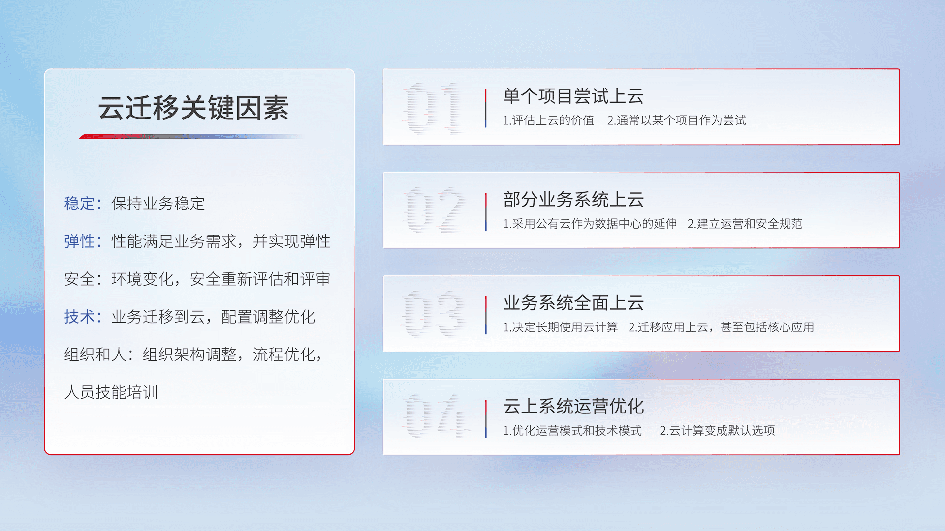 结合实际业务,,从规划设计、、、、云平台选型、、云原生改造、、数据迁移、、、集成交付,,迁移全过程为客户识别最佳上云路径,,,,做好风险识别管理,,,设计网络架构、、、、身份权限、、安全审计合规、、操作审计、、日志审计、、、、监控告警策略、、多站点容灾设计等,,,,对云上基础设施进行整体规划,,,,提升IT治理水平,,以满足弹性、、、高可用、、高性能的需求。。